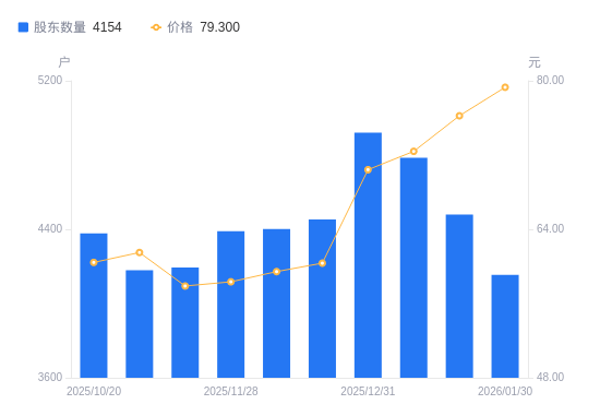 近一年(2025年2月10日至2026年1月20日),菱电电控A股股东户数从3237户,增加至4479户,增幅38.37%,区间股价上涨74.20%。